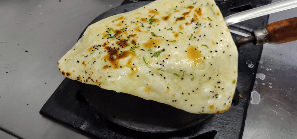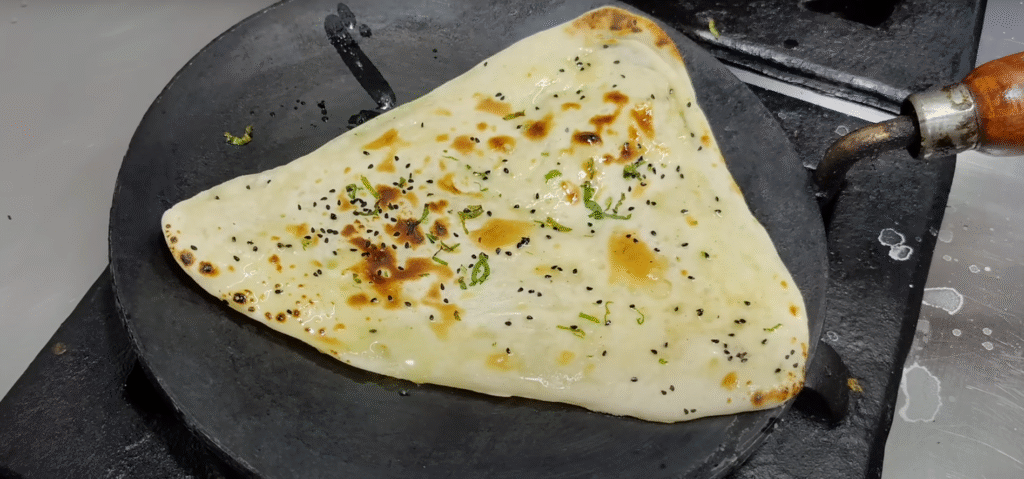 If you keep cooking on one side for a long time then the naan will start falling apart. So you have to cook it quickly from the upper side and as soon as the Naan gets cooked well,