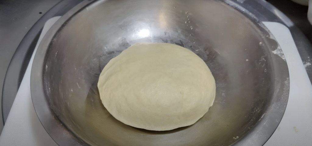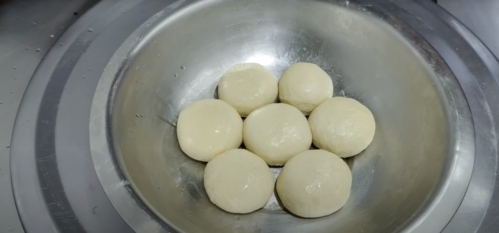 In this time the dough will be ready to make naan. Okay? See, it has been 15 minutes since I applied the dough here. Now after this you have to make pedas from it. Even after making pedas, they have to be given some rest. So follow each step one by one. Your naan can be made at home like restaurant naan. Try it. See, you have to make these pedas of a little bigger size because I have a big pan. If your pan is small then you can also make small size pedas. You can also make this naan in mini size. Okay? So this is how you have to make the pedas nicely round. And apply a little oil on the bottom of the vessel in which you will keep it. The Naan Peda that we make is prepared in batches of 90 grams to 120 grams. Apply a little oil. And after covering it from above, you have to let it rest for 5 minutes. Just give me a rest of 5 minutes. It will become very soft. And look, 11 Pedas are ready from 500 grams of flour. Let’s give them a rest of 5 minutes. You have to take a tawa. Take an iron tawa. Wash it well. There is no need to add masala. And I have to take another bowl. Put two-three teaspoons of salt in it. Add some water along with salt. Water and salt have to be mixed well here. I will tell you later where you have to use it. So look carefully, you have added salt and water. And it has been 5 minutes since I added the Pedas here. And see how soft the Pedas have become.