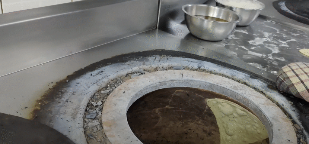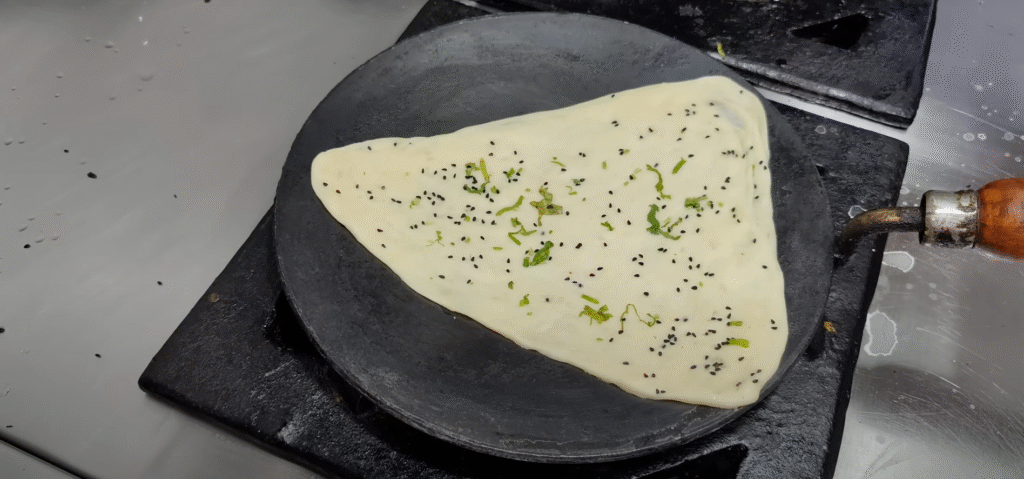 You can make them by hand as well.Make the naan with your hands. It is not made by rolling it with a rolling pin. So see, here I tell you the restaurant way. First of all you have to press the peda like this. And roll it on your hands like this. Our dough remains so soft. You have to apply a little butter on it. I am telling you the real way. The way butter is not applied. Coat it with a little dry flour. And fold it like this. Just like you make triangular parathas, do not press it lightly from the top. You have to let it rest for about 1 minute and after that make the naan like this. Then you have to put it on a cushion and pull it a little forward. Okay? Here the temperature of the tandoor is 220 to 240°. The naan needs to be cooked a little slowly. Only then it becomes crispy and it tastes good. So see the naan is cooked well. Let’s take it out. And after taking it out you have to apply butter on the butter naan. And this is the method of making plain naan as well. But don’t fold the plain naan. Let’s make it straight like this. And if you want to put extra butter then you can put some butter on the inner layer as well. And cut it into three pieces like this and serve. You can eat it with dal makhani, mixed vegetable, kadhai paneer, etc. Now here I tell you the method to make it at home. How can you make it at home? So first of all we will make plain naan. First of all you have to make the peda a little bigger like this. And you have to put some nigella seeds on it. If you don’t have nigella seeds then skip it. You can sprinkle some coriander leaves on top. You should not press the nigella seeds like this. Okay? And see above, I am also putting some coriander leaves in it. Now you have to roll it with the help of a rolling pin here. If you are making it at home then you have to roll the naan with a rolling pin and make it at home. See this, in this way you have to give it a little longer shape towards the front like the shape of naan. And after this you have to turn the naan upside down. See, this is how you turn the naan upside down. Then you must have prepared salt water, keep applying it little by little like this. If you have a brush, then you can apply water with the brush too. So you have to apply water all around here. Only then will the naan stick properly. Now lift the naan like this. You have to heat the pan lightly. See, the pan should be hot like this.