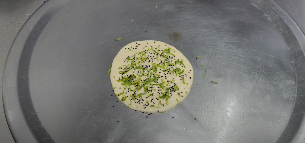 Now like you did not apply water in plain naan, the same method is with salt. This also does not have to be turned. And you can see, apply a little water like this. And then you have to cook it as well. Now how to cook it? By the way, you have to keep the temperature of the pan medium. And see, place the naan on the pan like this. Now after placing it on the pan,let it cook for 2 minutes. Light bubbles start appearing here on the naan. Look, the naan has started puffing up. Then you have to increase the gas flame. And cook all four corners of the naan thoroughly. Until it gets a good color. Look, this won’t be left.