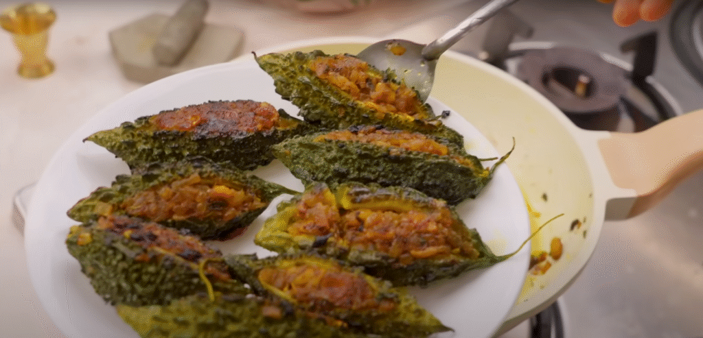 So here you just have to turn off the gas and take it out. Our super tasty and amazing bitter gourd is ready. Let me cut it and show you how soft it is.