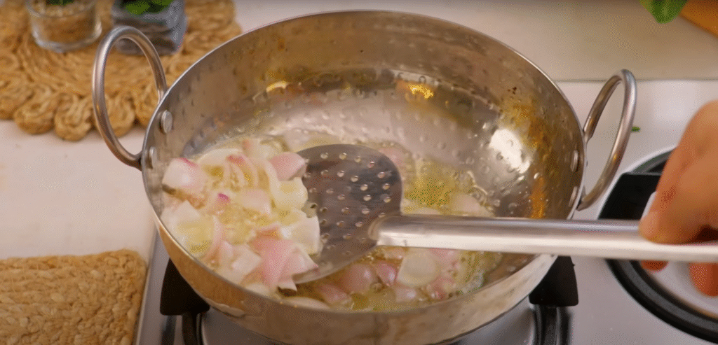 Just like we put onion pieces in Manchurian, we have to cut the onion into big pieces. Now we will fry the onion in oil for just 1 minute and then take it out from the pan.