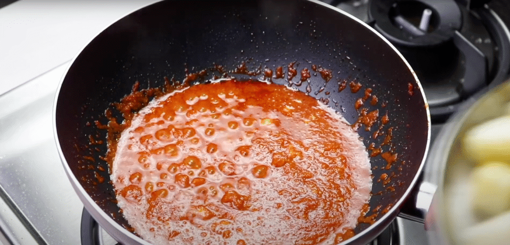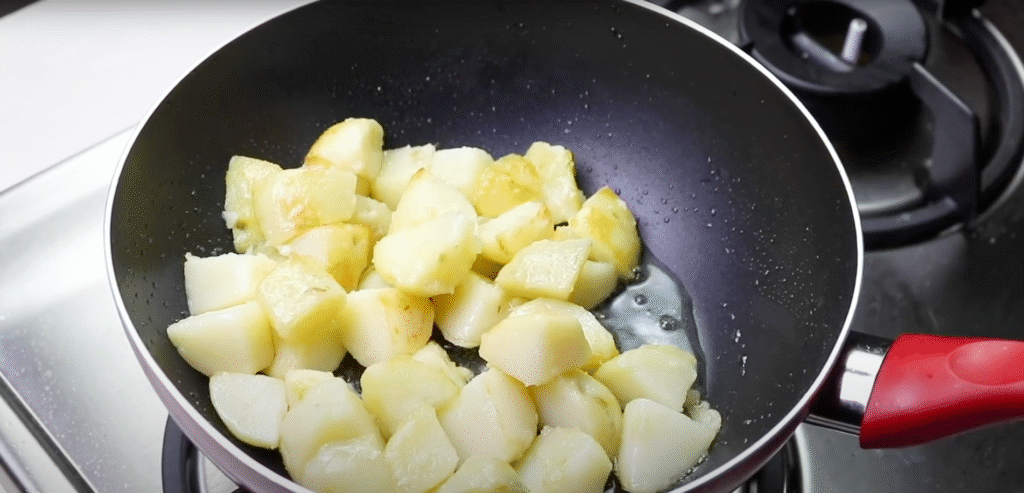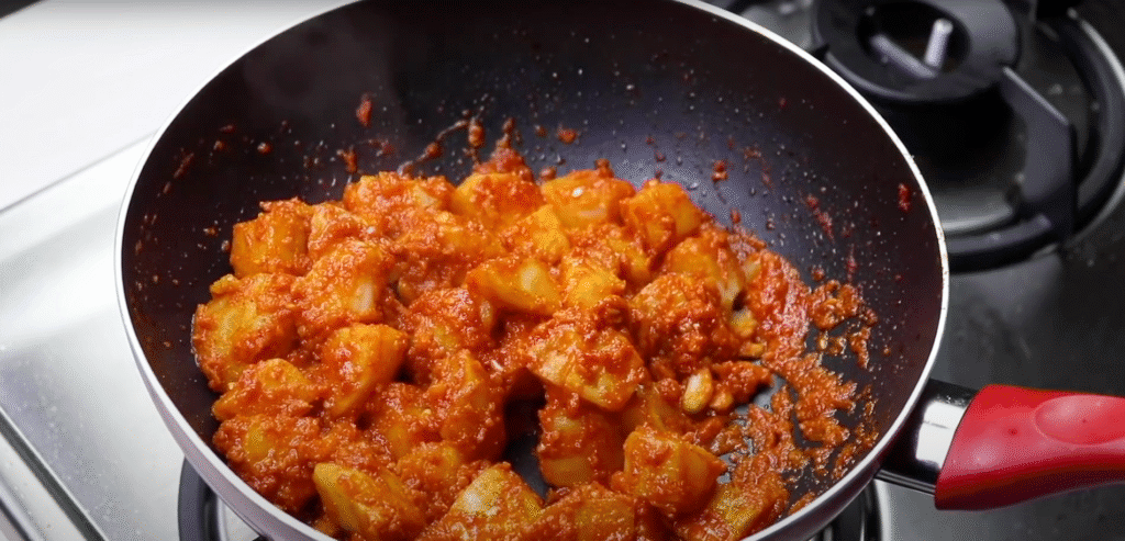 So our masala paste is ready. See, keep it a little coarse, there is no need to make it a very fine paste. Then we will heat oil in a pan and as soon as the oil gets hot, we will add potatoes to it. So here four boiled potatoes How have you cut the potatoes into pieces? We have to fry them first and take them out. So, we don’t have to do anything different. Just fry them for 2 minutes on medium flame. And when you see that the potatoes start to get slightly crispy, take out the potatoes. See, after taking out the potatoes, we will make the masala in the remaining oil. So, I am not adding oil here. I have just put this masala in the oil as prepared by Parshuram. We will keep the flame of the gas low here. And after adding this masala, first mix it well. We have used raw garlic in it. So, fry it well in the oil. So, cook it on low flame for two minutes. As soon as the oil starts appearing on the edges of the masala, it means that our masala has been fried well. Now, we will add water to it. We have to use a little water. So, add about one-third cup of water to it.