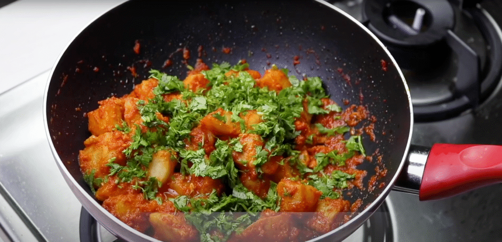 After adding water, we will mix it like this. Now, we will cover the pan and cook it on low flame for 1 minute. After one minute, we removed the lid of the pan. Mix it. Our gravy is ready. We have to add potatoes. If you want to make a dry vegetable, do not use more water and after this, add the shredded potatoes in it. Add salt according to taste or add one teaspoon of salt. After adding salt, mix it like this and after this, cover the pan and cook it on low flame for two more minutes. Here, you can see the color of the vegetable if it looks brown. After 2 minutes, remove the lid of the pan and mix it once like this. You can see that the spices that we have used have been coated well. So, now what will we do? Turn off the gas and after this, add 1 tablespoon of lemon juice to it. By adding lemon juice, its taste will be known, but the strong sourness will reduce. Add finely chopped coriander leaves and with this, add half a teaspoon of chaat masala powder. If you are using chaat masala, add less salt in it first because chaat masala contains salt, so keep this in mind and mix it well. Keep in mind that lemon and chaat masala powder should be added after turning off the gas. Our spicy Gandhi Potato is ready. This vegetable looks very good.