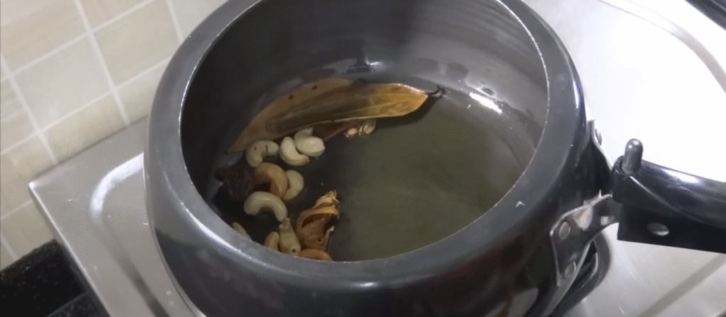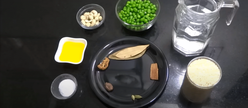 To make matar pulao or peace pulao, I took one glass of basmati rice. If we measure it by weight, then it is 200 grams of rice. I have measured it by glass here. So for one glass of rice, we will use 1.25 i.e. one and a quarter glass of water. I have taken 100 grams of peas. I have used frozen peas here, but if you want, you can also use fresh peas in place of this. I have taken two bay leaves. I have taken a little cinnamon. Two small cardamoms, break them. One big cardamom, break it as well. I will take a little mace. I have not used cumin seeds in this pulao. You should also not use it. Take some cashew nuts. I have taken around 12 to 15 grams of ghee. Three to four tablespoons. If you don’t like ghee, then use oil and we will take one-third teaspoon of salt. First of all, we will wash the rice. For that, put it in a vessel and wash it two-three times with water. I have washed it. Now, add one glass of water to the rice and leave it to soak for 10 to 15 minutes. Till the rice is soaking, I have heated a pressure cooker pan on the gas and will add ghee.