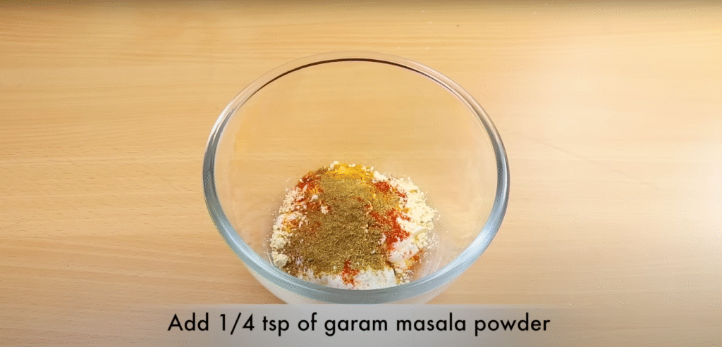 To make paneer tikka masala, first of all, put two to three tablespoons of curd in a vessel. If you use curd prepared at home, then use only two spoons. Put one tablespoon of gram flour here. After this, we will add celery seeds. Celery gives a good taste, but you can make it without it as well. So, here, add 1/ 4th teaspoon of celery seeds, 1/3rd teaspoon of turmeric powder, 1/2 teaspoon of Kashmiri red chili powder, 1/3rd teaspoon of coriander powder, 1/3rd teaspoon of cumin powder, a little garam masala powder, and at last, we will add this tandoori masala powder. You can also use Kitchen King Masala instead.