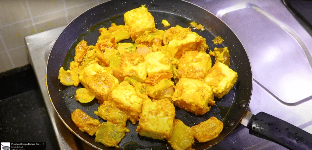 Add a little oil. After this, we will mix it well. We have to coat the paneer first. So now we will add salt to it. So use a little salt here because we have to use salt in curry as well. So add a little salt and beat it well to make a thick batter. Do not use water in it. So our batter is ready. Now we will add cubes of paneer to it. I have made big pieces of paneer here. You can use smaller pieces if you want. I have used 250 grams of paneer here. After this, we will add capsicum to it. I have taken red, green and onion and yellow capsicum. I have cut all of them into cubes. I have cut them like paneer and after this, we will marinate it with paneer. If you do not have red and yellow capsicum, then you can use only green capsicum and onion. So mix it well here. Now we will cover it and keep it in the fridge for 20 minutes. After 20 minutes, I took it out of the fridge and I used it. Once we mix it well, the paneer here is well coated with curd and spices. So now we move on to the process of cooking it. So turn on the gas and heat oil in a pan, spread the oil well and after that, just like we make paneer tikka, place this marinated paneer on the pan, spread it in such a way so that all the paneer gets cooked evenly. Here, I have put paneer, capsicum and onion, everything on it and cook it on medium flame for 5 to 7 minutes. Keep turning it in between so that it doesn’t burn. If you want, you can put the paneer tikka on a skewer and then cook it in the oven too. So, our paneer is cooked well from both the sides. You can see a brown layer is visible on it. The paneer looks a little crispy. So, our paneer tikka is ready.