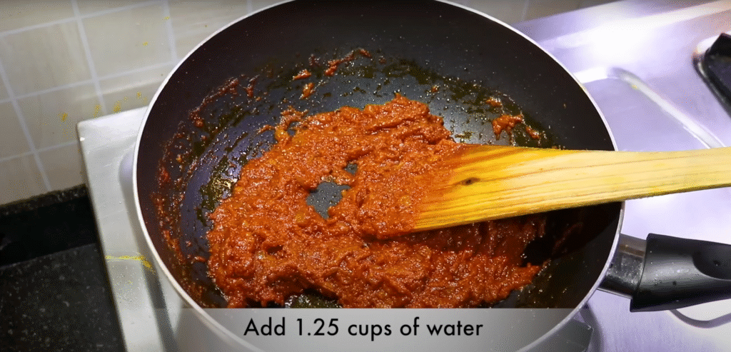 Now we move on to the process of making the gravy. Remove it from the gas and keep it aside and heat another pan on the gas. Pour oil back into the pan. And as soon as the oil gets hot, add cumin seeds. Cook the cumin seeds a little. After that add two medium-sized onions, finely chopped. We will fry the onions on medium flame for three to four minutes or until they turn brown. Keep the flame of the gas medium and our onions are fried. So now we will add one teaspoon ginger and garlic paste to it. After that mix this ginger and garlic. We will fry it on medium flame for half a minute with onions. After this, we will make the flame of the gas low and add half a teaspoon turmeric powder. Add one teaspoon Kashmiri red chilli powder here. It is less spicy. We will add half a teaspoon coriander powder. Half a teaspoon cumin powder. We will use garam masala later. Cook the spices on low flame for half a minute. When you put the spices in the oil, the color of the vegetable will be very good. Just make sure that the flame of the gas is low. After this, we will add one-third cup tomato puree to it. If you do not have tomato puree, then finely chop two small tomatoes and add them or Grate the tomato and add it and mix it well. Puree gives a good color to the vegetable, that’s why I have used this. Now when we cook the tomato puree with the spices, cover the pan and let it cook on low flame for 5 to 7 minutes until oil is visible from the sides of the spices. You can see that our masala is fried, oil is visible from the sides.
