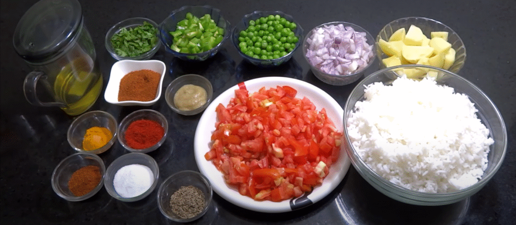 I have taken half a kilo of boiled rice. I have already cooked it and if you want the recipe for making rice, You can also use the leftover rice in this Tawa Pulao recipe. I have finely chopped four medium-sized tomatoes. Take two boiled potatoes and cut them into small pieces. Two onions finely chopped. Fresh or frozen peas, about 50 grams. I have used frozen peas here. One medium-sized capsicum finely chopped. One tablespoon ginger-garlic paste. Cumin seeds. We will take one teaspoon oil. I have used here. I used four tablespoons of finely chopped coriander leaves and the main ingredients of this tawa pulao are garam masala powder, half a teaspoon of salt according to taste and the last ingredients are two tablespoons.