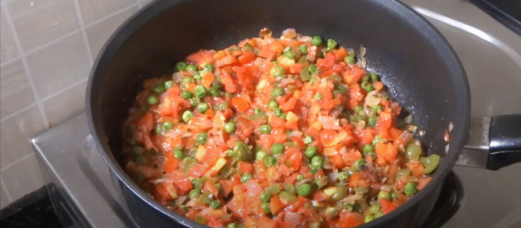 First of all, I have turned on the gas and heated the pan here. Once the pan is hot, pour oil in it. Let the oil heat up well. Then we will add cumin seeds to it and cook the cumin seeds a little on medium flame. Then we will add chopped onion to it. We will fry the onion on medium flame for two to three minutes or fry it until its color becomes golden. Do not cover it. After two-three minutes, we will see that the onion has been lightly fried. See, now we will add green peas here. Add capsicum as well and mix both of these with the onion and cook for at least two to three minutes. I have mixed it on medium flame and let it cook. If you want, you can also cover the pan. I have kept the flame of the gas medium. We will keep stirring it in between so that it It should not burn and you can see that capsicum and peas have also been fried a little with the onion, so what we will do now is we will make the flame of the gas low and then we will add this ginger garlic paste to it, mix it, we will cook ginger garlic with onion for at least one more minute on low flame so that its raw flavour goes away, so leave it for a minute and after a minute we will see that ginger garlic has also been cooked a little, so add this tomato here, mix the tomato well, now we have to cook this tomato with onion capsicum peas for at least three to four minutes, make the flame of the gas medium so that the tomato gets cooked quickly and cover the pan, after three to four minutes we will see that more than half of this tomato has melted, see, let the tomato melt completely well, now we will add spices to it, so for this reduce the flame of the gas here and then this turmeric powder, red chilli powder, if you eat more spicy then use more, then mix it, we will cook the spices a little with tomato, so cover the pan and cook it for a minute Let it remain on flame for one minute, remove the lid of the pan and you can see that the tomatoes have melted well and the spices have also been cooked. Now we will add boiled potatoes in it. Mix the potatoes well. After mixing the potatoes, we will add the pav bhaji masala here. I have added two teaspoons of masala here. If you want, you can use a little more masala. Add the pav bhaji masala and after mixing the spices, what will we do, we will cook this masala a little. So cover the pan and let it cook on low flame for two minutes. After two minutes, remove the lid of the pan and we will see that the pav bhaji masala has also been fried well along with the rest of the spices.