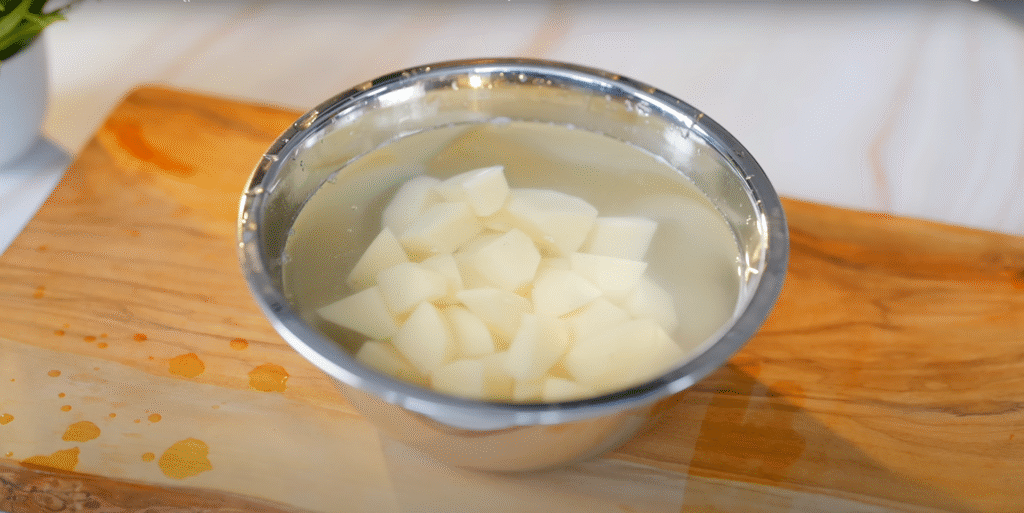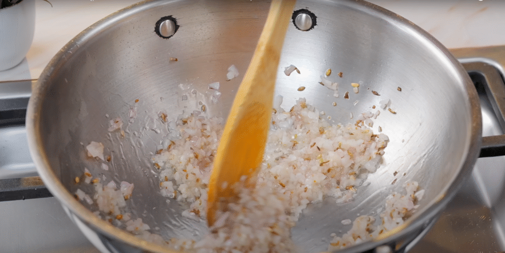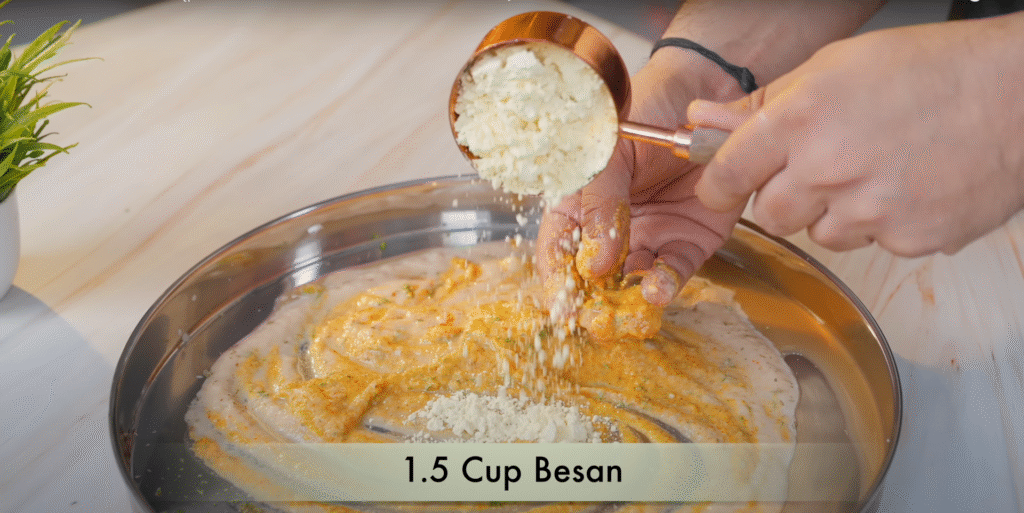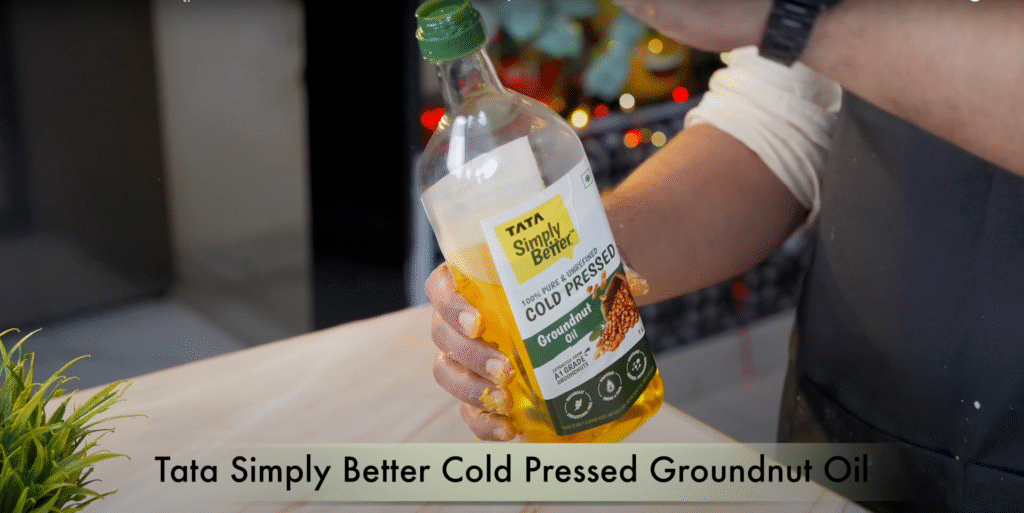 so to make this curry I have taken two small potatoes here, remember not to use very big potatoes, take small potatoes only and cut them into small pieces like this, now directly put it in the mixer and in the mixer I have added 1/2 inch ginger, one green chilli, add three-four cloves of garlic and along with it add the chopped potatoes, remember not to add any water here at all while grinding and while grinding always grind in pulse mode in the beginning, after grinding in pulse mode then grind on very low speed for a long time, only then you will get a perfect paste, now I had deliberately told you not to use too many potatoes here, the reason for this is that there is a lot of water in potatoes, so directly spread the potato paste in a big plate and then pour salt, celery and some other basic things like turmeric. Powder, add half a teaspoon of red chili powder, half a teaspoon of garam masala and add kasuri methi along with fresh coriander because kasuri methi tastes very good with gram flour. I have already mixed all these things and spices well and now I have added gram flour here. In total, friends, I have just added one and a half cup of gram flour here and I will add half a cup more at the end and you should watch that step carefully that why it has to be added at the end. For now, mix one and a half cup of gram flour slowly and yes, do not forget to add desi ghee in it, otherwise your vegetable will become a little tight because its texture is a bit like gattu, you should mix it slowly and you will feel that it has become completely pasty and that is why I told you to use less potatoes but a stage will come when it will join but there will be a lot of it sticking to your plate on the sides, so add some more dry gram flour here which you had saved for half a cup and take out the entire gram flour properly from this plate. Now clean your hands and add the entire gram flour only at the end because If you join it with wet gram flour hands, it will not join and then see, you will get a nice peda, isn’t it very easy? In the end, I have applied some peanut oil here nicely so that the gram flour does not stick anywhere and you can leave it to rest for about 10 minutes while we prepare the gravy here. So, I have taken 9 tablespoon curd here, keep in mind that the curd should not be sour and in the same I have mixed one spoon of Garam Masala and one tablespoon of grinded Kasuri Methi. Adding curd will give a creamy texture and the sourness will also be enhanced. Along with that, I have added tomatoes in the mixer here and along with these tomatoes, you can also add some ginger, chilli and garlic here and make a nice fine paste of it. That’s it friends, the preparations are complete, now let’s go straight to the pan, so in the pan, I have put peanut oil here and if you have to use peanut oil, then the taste of peanuts should be there. So, I have used this oil in the pan. We have used Tata Simply Better Cold Press Ground Oil. It is extracted by grinding A1 peanuts, friends, it is done through cold press method only then the peanuts get a perfect taste. In hot oil, add asafoetida, one teaspoon cumin seeds and along with it half teaspoon fennel seeds and directly chop two onions very finely and add them. If you cannot do fine chop then you can absolutely use a chopper but here you have to cook the onions till they turn brown.