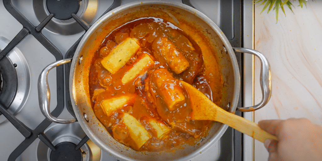 so as soon as you add the curd, quickly stir something and in hardly two minutes it will happen that the oil will start separating again, just now pour two to three cups of water here, keep a sieve over this gravy and arrange all our potato and gram flour rolls on the sieve like this, we are basically going to steam them, you can also directly steam them as gravy You can also cook for 10 minutes by putting it in the pan, that is also an option, I will tell you right now, but there is an advantage in steaming, for now, cover it for 10 minutes and let it cook completely on a very low flame so that our gram flour rolls also get cooked and our gravy gets completely set, see how the oil has separated, you mix it and your gravy is completely ready, friends, I will tell you one thing about these gram flour rolls, when you cut them and see, they are cooked well from inside, but because there is not much ghee and oil in it, they will be dry, so if you do not like this dryness, you can try it and if you do not like it, then you can also fry them on my advice, see, I will show you, if you feel that frying them will become heavy, then you can also put them directly in the gravy like me, the only difference will be that they will be slightly dry from inside, after putting them in the gravy, cover them and cook for 5 minutes and that’s it friends, your completely new type of potato gram flour curry is ready. You will definitely like to see this.